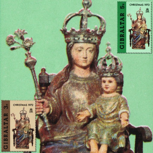 Na znaczkach widnieje rzeźba Marii patronki Europy, a także patronki Gibraltaru.