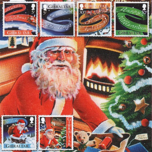 Na znaczkach widnieją życzenia świąteczne i święty Mikołaj z prezentami.