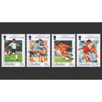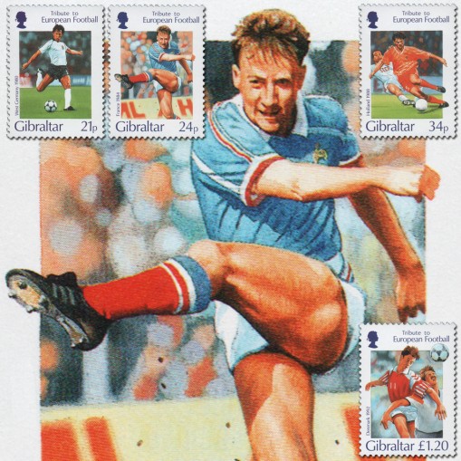 Na znaczkach widnieją: piłkarz niemiecki w 1980 roku, piłkarz francuski w 1984 roku, piłkarz holenderski w 1988 roku i piłkarz duński w 1992 roku.
