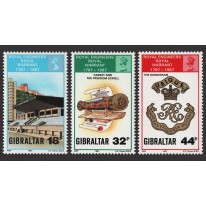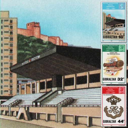 Na znaczkach widnieją kolejno: Stadion Wiktorii w Gibraltarze, zwój deklarujący wolność Gibraltaru oraz odznaka formacji Royal Engineers.