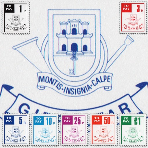 Znaczki dopłaty, na których widnieje trąbka pocztowa i herb Gibraltaru.