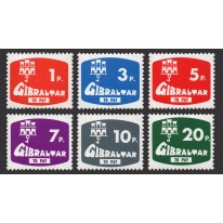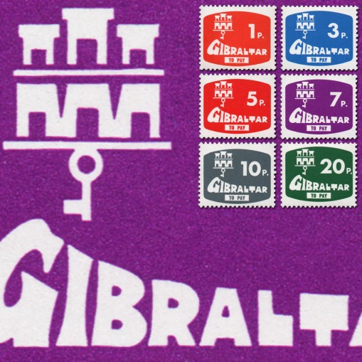 Znaczki dopłaty, na których widnieje herb Gibraltaru - zamek i klucz.