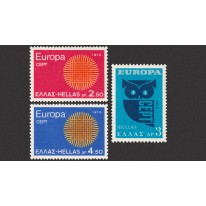 Jeden ze znaczków greckich ma odmienną szatę graficzną i przedstawia sowę, której głowa składa się z dwóch trąbek pocztowych.