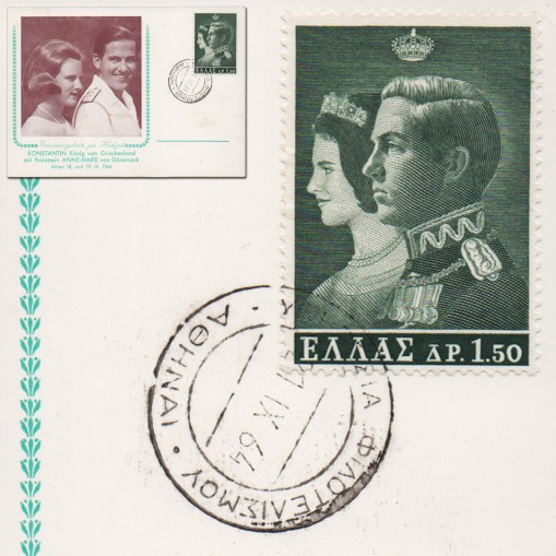Znaczek na karcie maksimum upamiętniający ślub króla Konstantyna II Greckiego i księżniczki duńskiej Anny-Marii Glücksburg.