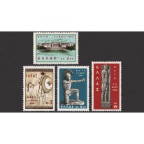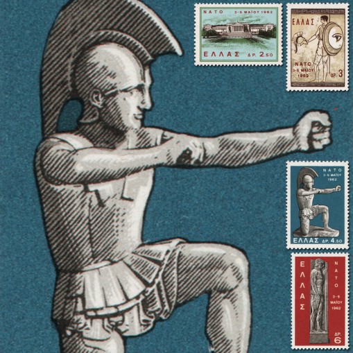Na znaczkach widnieje budynek Zappion w Atenach oraz starożytne przedstawienia wojowników.