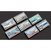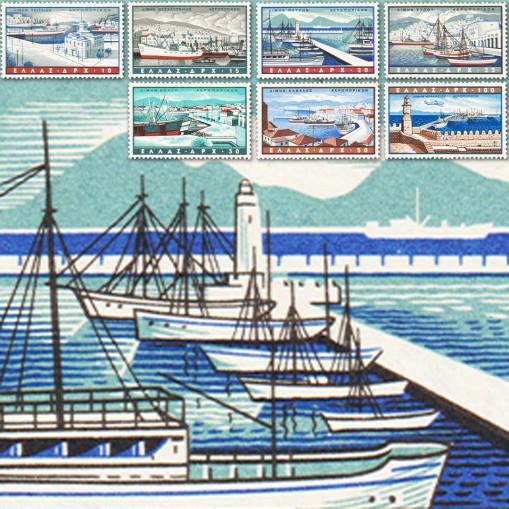Na znaczkach przedstawiono widoki z portów greckich, a są to Pireus, Saloniki, Patras na Peloponezie, Ermupoli na wyspie Siros, Wolos w Tesalii, Kawala w Macedonii oraz Heraklion na Krecie.