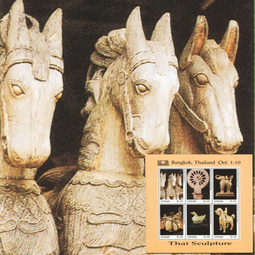 Na znaczkach widnieją tajskie rzeźby, m.in. drewniane konie oraz słoń i kaczka z brązu.