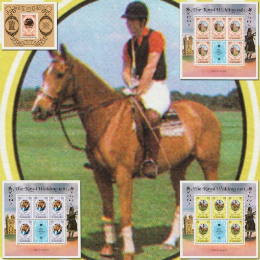 Na znaczkach widnieją nowożeńcy, dom Holyrood House, książę Karol na koniu grający w polo oraz kareta królewska.