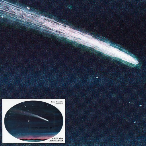 Znaczek w bloku upamiętniający badania komety Halleya, pierwszej zidentyfikowanej komety krótkookresowej.