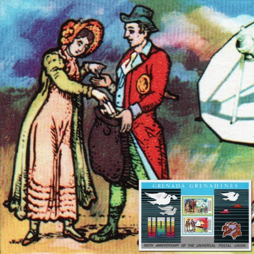 Na znaczkach widnieją listonosze oraz antena paraboliczna i pociąg.