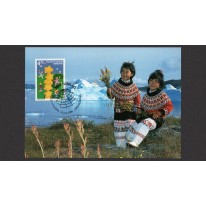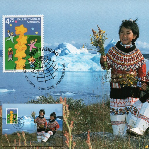 Na karcie widnieją grenlandzkie dzieci w tradycyjnych strojach.