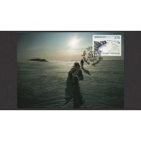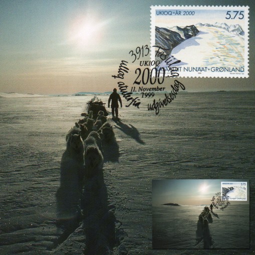 Na znaczku widnieje lądolód grenlandzki. Na karcie zaś przedstawiono psi zaprzęg.