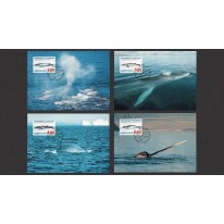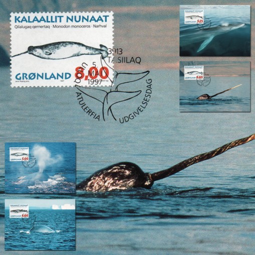 Seria na kartach maksimum, na znaczkach której widnieją następujące gatunki waleni występujące na Grenlandii: