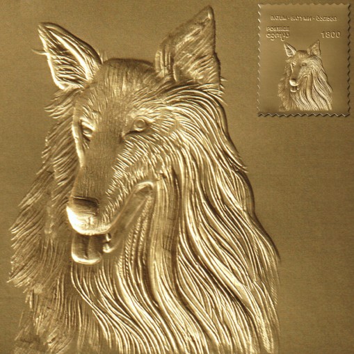 Nieautoryzowany znaczek wytłoczony w złotej folii, wprowadzony na rynek filatelistyczny pod koniec zeszłego lub w tym wieku jako oficjalny walor pocztowy Batumi, stolicy autonomicznej republiki Adżarii w Gruzji.