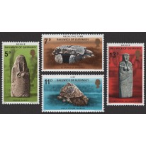 Seria, na znaczkach której widnieją prehistoryczne menhiry i grobowce znajdujące się na wyspach Guernsey i Alderney.
