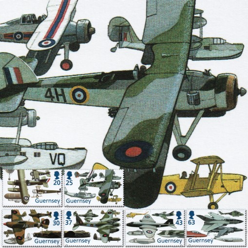 Na znaczkach widnieją różne brytyjskie samoloty z XX wieku:
