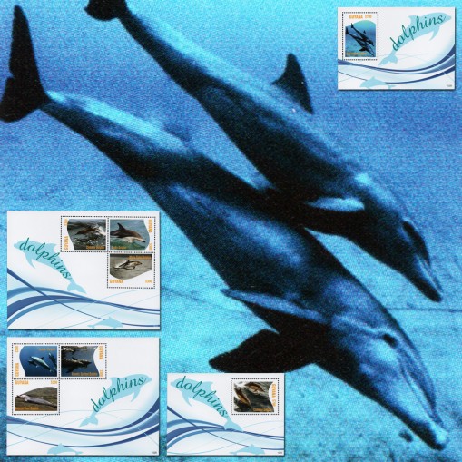 Seria w dwóch arkuszach i dwa bloki, na znaczkach których widnieją następujące gatunki delfinów: