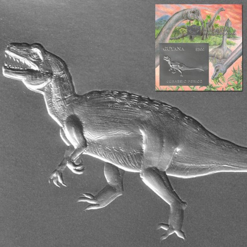Na znaczku przedstawiono tyranozaura, na bloku zaś widnieją dinozaury roślinożerne.
