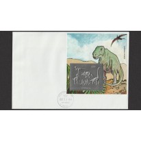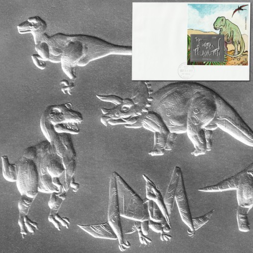 Srebrny znaczek w bloku na kopercie FDC, na którym widnieją różne gatunki dinozaurów, między innymi tyranozaur, triceratops, apatozaur i pteranodon.