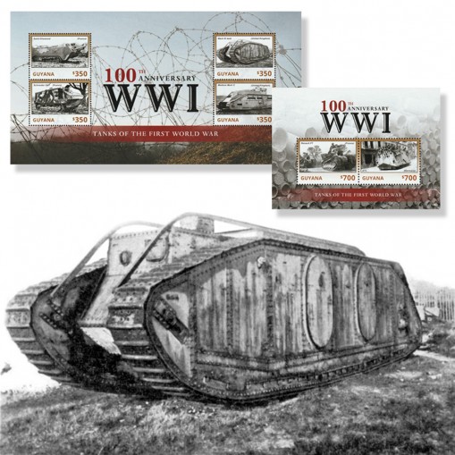 Na znaczkach przedstawiono pierwsze czołgi, jakie zaczęły pojawiać się na liniach frontów.