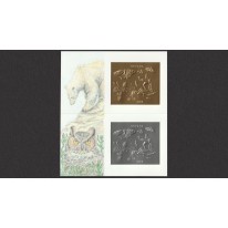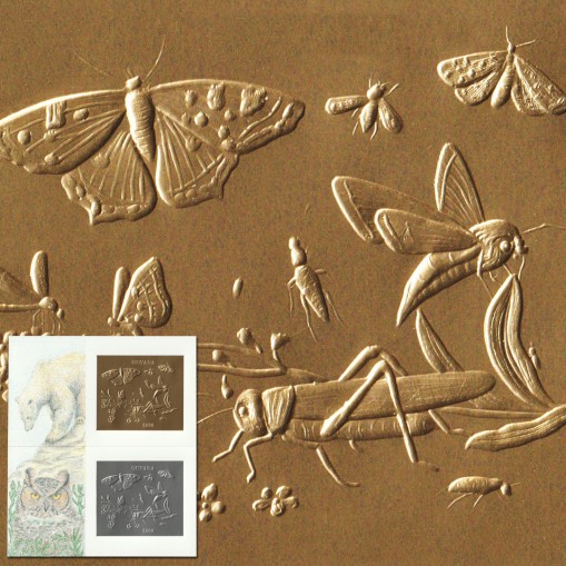 Znaczki (jeden złoty i jeden srebrny) w bloku, na których przedstawiono owady (m.in. motyla i konika polnego). Na samym bloku widnieją niedźwiedź polarny i sowa.