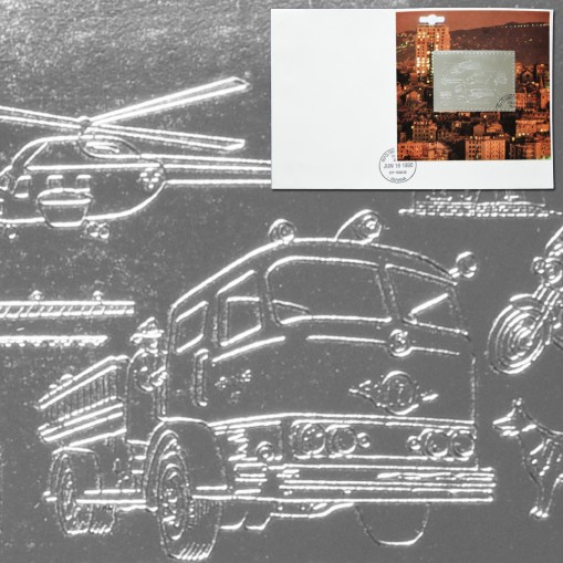 Na znaczku widnieją: helikopter, latarnia morska, szlaban kolejowy, motocykl, wóz straży pożarnej i pies pasterski.