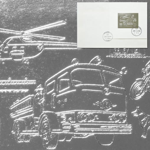 Na znaczku widnieją: helikopter, latarnia morska, szlaban kolejowy, motocykl, wóz straży pożarnej i pies pasterski.