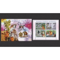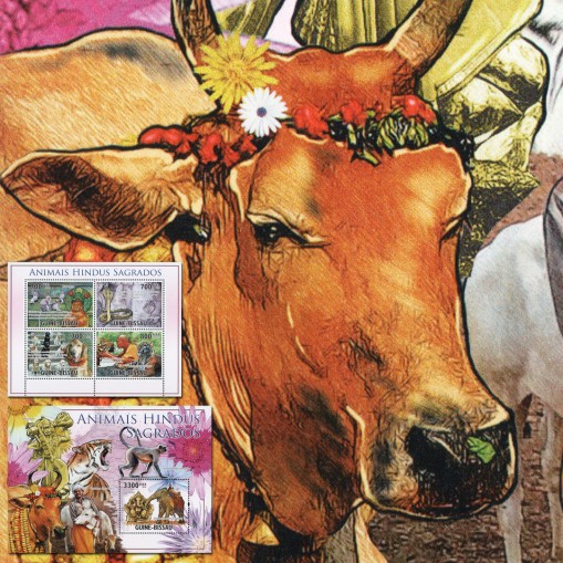 Seria w arkuszu i blok, na znaczkach których widnieją gatunki zwierząt czczonych w Hinduizmie: małpy, kobra indyjska, psy, tygrysy i słoń indyjski.