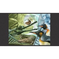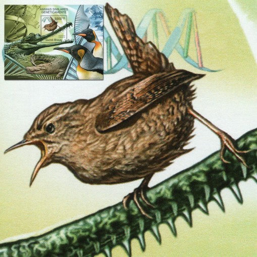 Znaczek w bloku wydanym pod hasłem fauny i genetyki, na którym widnieje ptak strzyżyk.