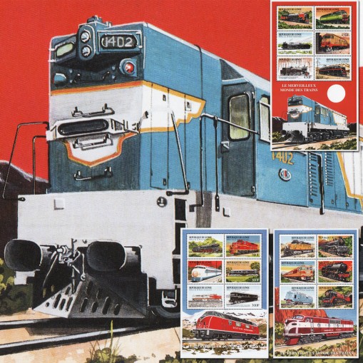 Zestaw trzech arkuszy, na znaczkach których widnieją lokomotywy z całego świata, kolejno: