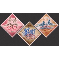 Na znaczkach widnieją kolejno: biegacze, kolarze i kajakarze.