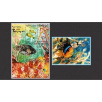 Seria w arkuszu i blok, na znaczkach których widnieją następujące gatunki ryb tropikalnych: