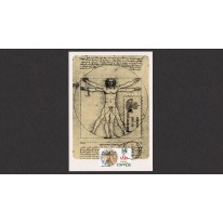 Znaczek na karcie maksimum przedstawiający tzw. „człowieka witruwiańskiego” - rysunek Leonarda da Vinci z ok. 1490 roku będący studium proporcji ludzkiego ciała. W tle widnieją półkule Ziemi i Księżyca.