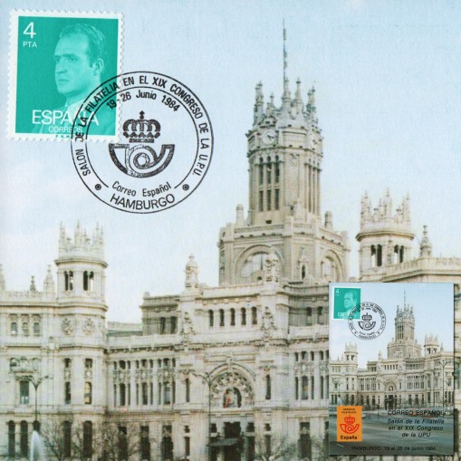 Znaczek na karcie maksimum promującej pocztę hiszpańską na międzynarodowej wystawie filatelistycznej i XIX kongresie Światowego Związku Pocztowego w Hamburgu.