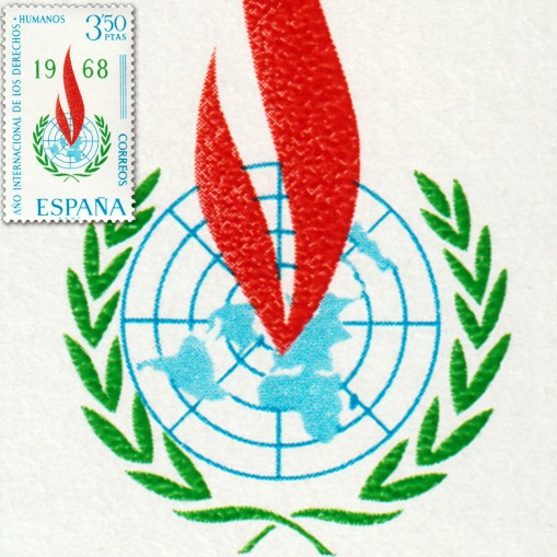 Znaczek upamiętniający Międzynarodowy Rok Praw Człowieka. Widnieje na nim emblemat tegoż roku.