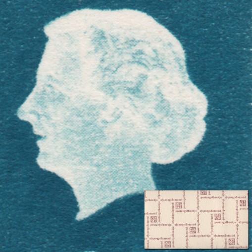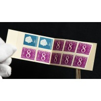 Znaczki obiegowe w zeszyciku filatelistycznym, na których widnieje cyfra 8 i popiersie królowej Juliany.