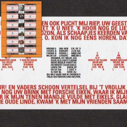 Znaczek w arkuszu, na którym widnieje flaga holenderskiej prowinzji Drenthe ułożona ze słów jej hymnu.