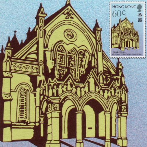 Znaczek upamiętniający stulecie katolickiej katedry w Hongkongu.