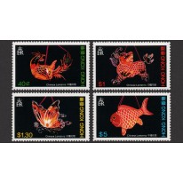 Na znaczkach widnieją chińskie lampiony w kształcie koguta, jednorożca, motyla i ryby.
