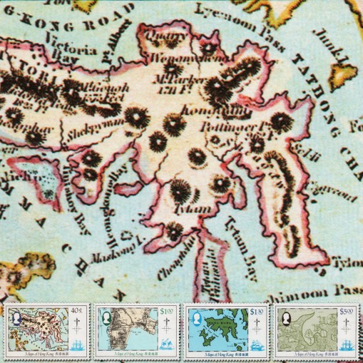 Na znaczkach widnieją stare mapy Hongkongu, kolejno: