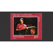 Znaczek upamiętniający śmierć Indiry Gandhi (1917-1984), polityka, premiera Indii w latach 1966–1977 oraz 1980–1984. Była ona trzecią w historii premier Indii i centralną postacią Indyjskiego Kongresu Ludowego, drugą co do długości piastującą urząd premiera Indii i jedyną kobietą sprawującą funkcję premiera w Indiach. Została zamordowana przez sikhijskich fundamentalistów w odwecie za rządową operację Niebieskiej Gwiazdy.