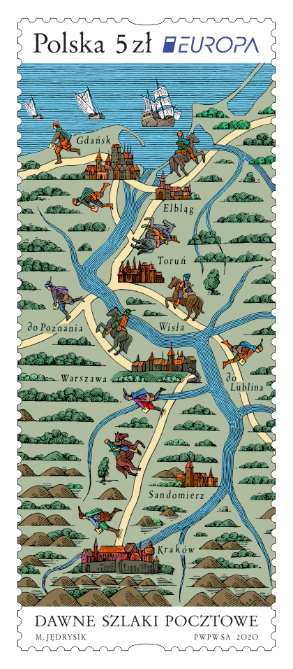 Autor projektu polskiego znaczka Maciej Jędrysik przedstawił fragment schematycznie ujętej mapy Polski z zaznaczonymi głównymi szlakami pocztowymi funkcjonującymi w XVI w., wraz z naniesionymi na nich wizerunkami posłańców pieszych i konnych. W centralnej części znaczka umieszczono bieg rzeki Wisły wraz z usytuowanymi nad jej brzegami sylwetkami miast królewskich oraz nazwami miast: Kraków, Sandomierz, Warszawa, Toruń, Elbląg, Gdańsk.