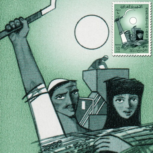 Na znaczku widnieją rolnicy przy zbiorach zboża.
