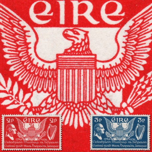 Na znaczku widnieje pierwszy prezydent Stanów Zjednoczonych Ameryki George Washington, herb USA i irlandzka harfa.