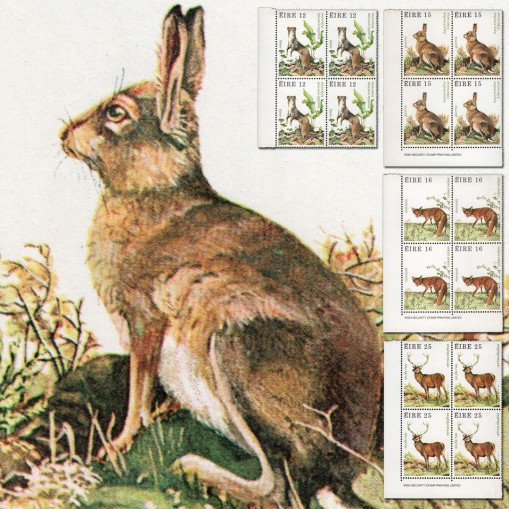 Na znaczkach widnieją kolejno: gronostaj, zając bielak, lis i jeleń.
