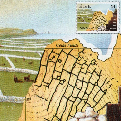 Znaczek upamiętniający otwarcie ośrodka informacji turystycznej przy neolitycznym stanowisku archeologicznym zwanym Céide Fields będącym najstarszym znanym przykładem układu pól uprawnych na świecie.