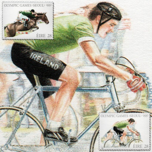 Na znaczkach widnieje jeździectwo i kolarstwo.