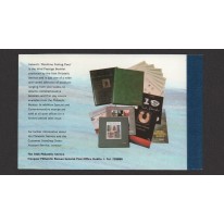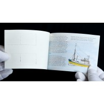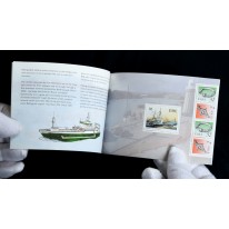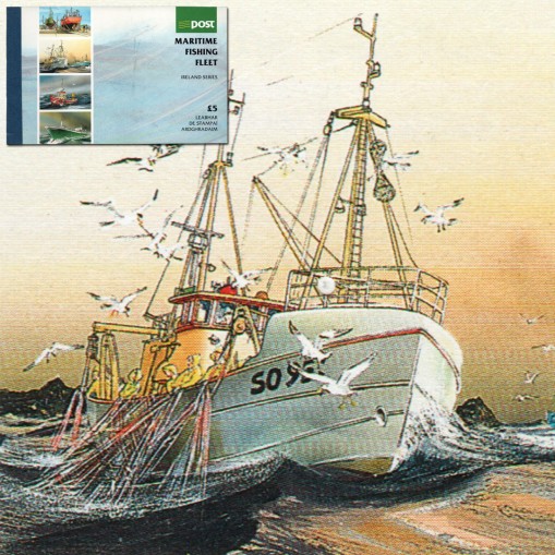 Znaczki w zeszyciku filatelistycznym pochodzące z serii obiegowej przedstawiającej starożytną irlandzką biżuterię i naczynia oraz serii okolicznościowej przedstawiającej statki rybackie.
