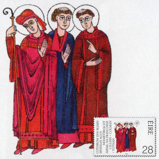 Znaczek upamiętniający 1300. rocznicę męczeńskiej śmierci świętych Kiliana, Kolonata i Totnana, misjonarzy irlandzkich chrystianizujących tereny Franków.