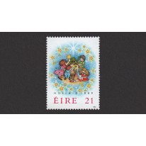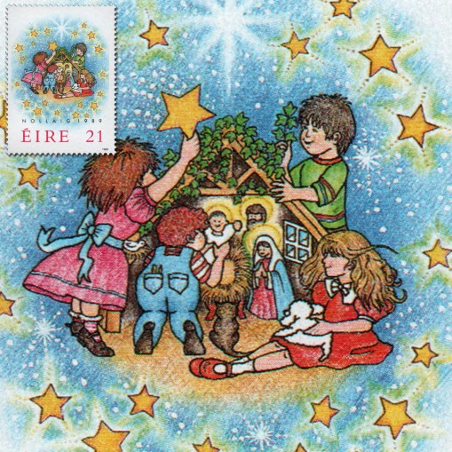 Na znaczku widnieją dzieci dekorujące szopkę bożonarodzeniową.
